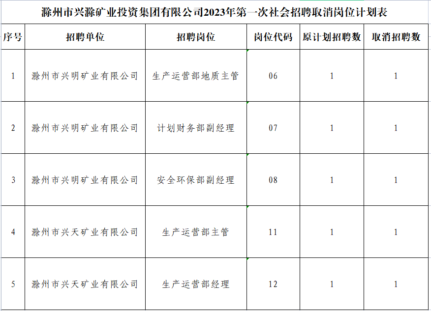根據(jù)《滁州市興滁礦業(yè)投資集團(tuán)有限公司2023年第一次社會(huì)招聘公告》規(guī)定,經(jīng)對(duì)各崗位報(bào)名情況篩查審定,部分崗位報(bào)名情況未達(dá)到開(kāi)考比例,經(jīng)研究決定取消以下崗位招聘計(jì)劃: